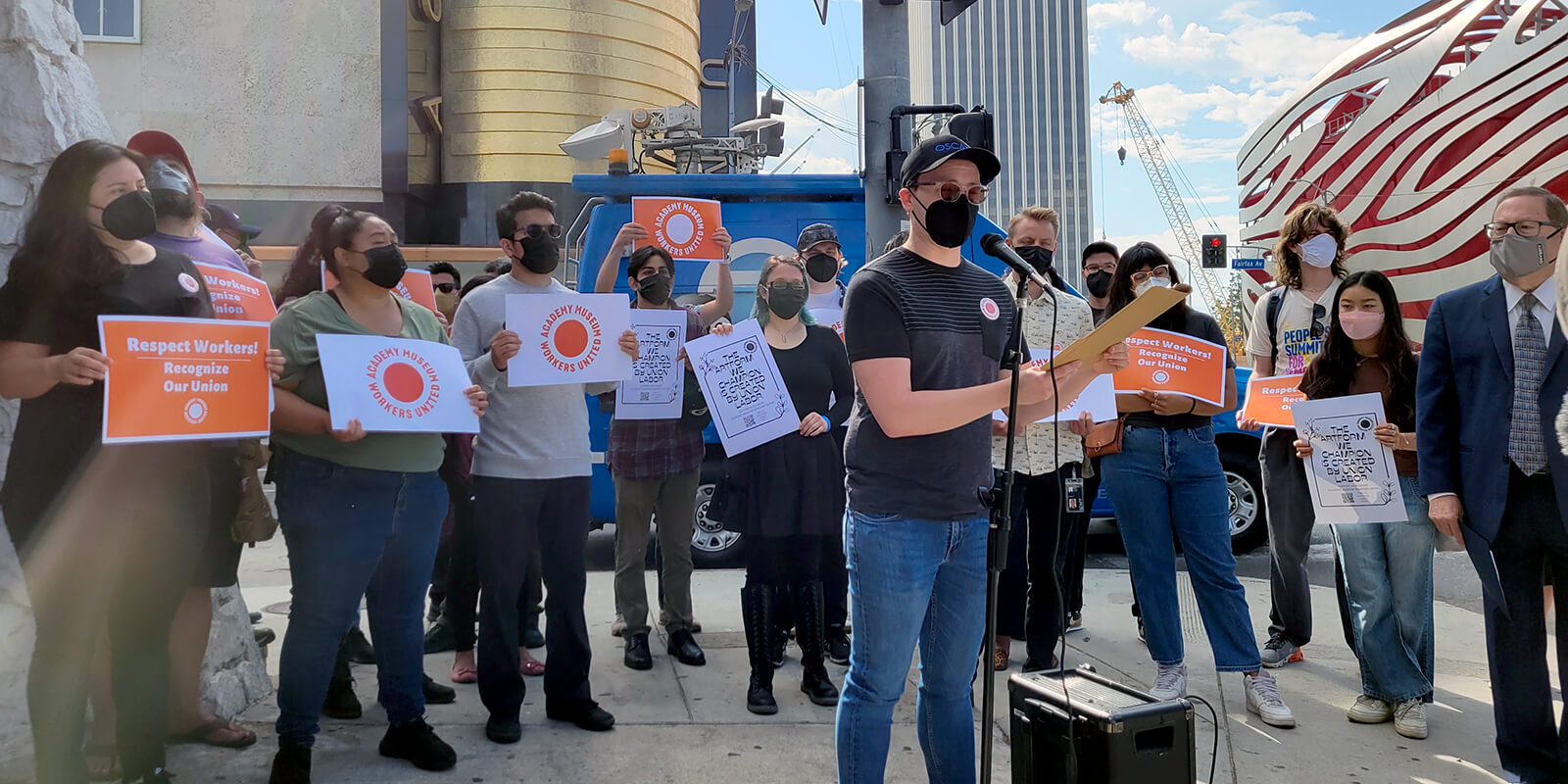 La Unión de Trabajadores del Museo de la Academia (Academy Museum Workers United, o AMWU) está organizando a casi 200 trabajadores, y una mayoría de ellos ha firmado tarjetas de autorización sindical. Miembros de AMWU buscan el reconocimiento voluntario de su empleador para evitar un largo y costoso proceso electoral a través de la Junta Nacional de Relaciones Laborales.